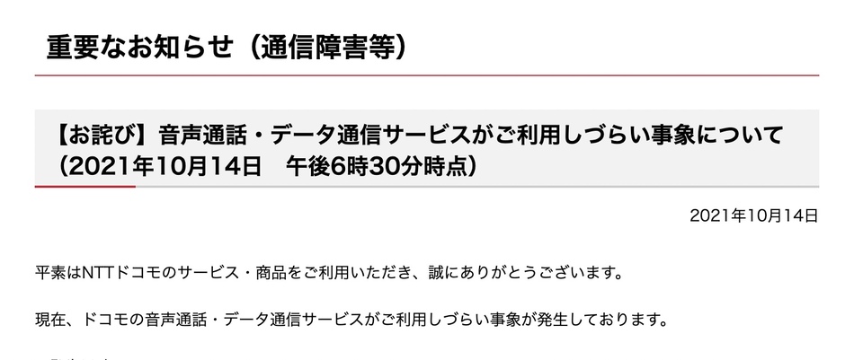 ドコモ 通信障害 2021. 1 day ago2021年10月14日 平素はNTTドコモのサービス商品をご利用いただき誠にありがとうございます 2021年10月14日木曜午後5時00分頃からドコモの音声通話データ通信サービスがご利用しづらい事象が発生しておりましたが10月15日金曜午後10.
