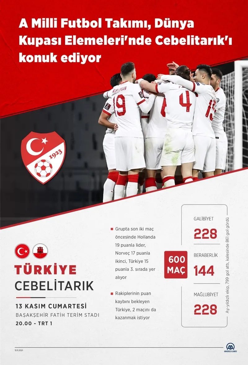 Maçı kapsamında gerçekleşecek olan Türkiye-Cebelitarık karşılaşması 13 Kasım 2021 tarihinde. A Milli Takımımız 2022 Dünya Kupası Elemelerinde G grubundaki 5. Bugün de heyecan doruklarda.